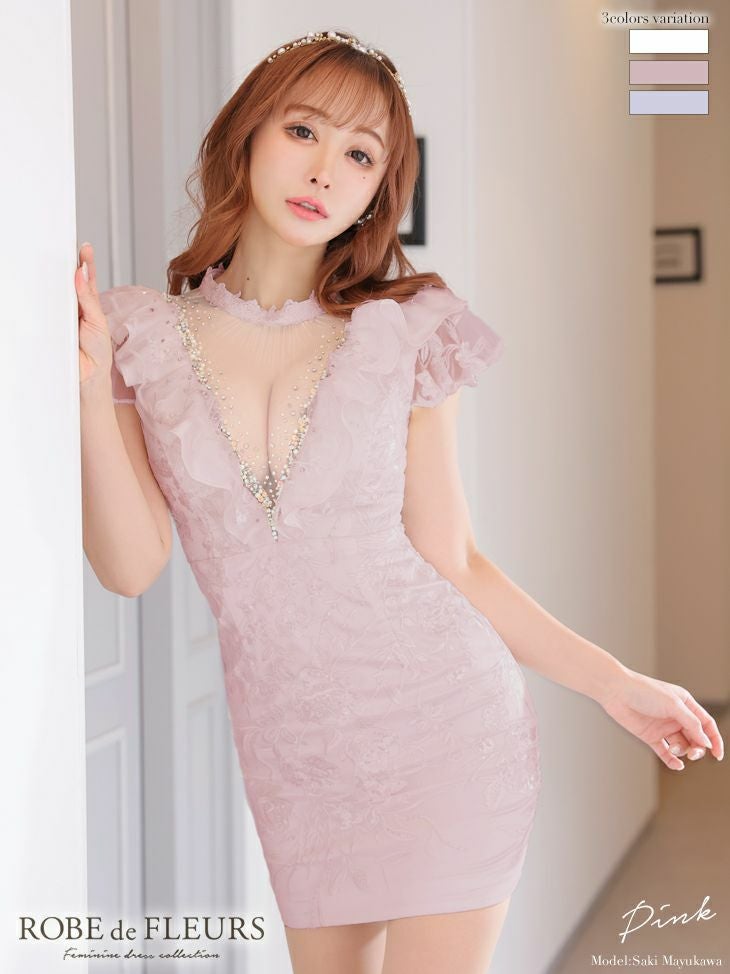 5. [ROBEdeFLEURS/ローブドフルール] 高級ビジューラインVカット×フリル半袖タイトミニドレス