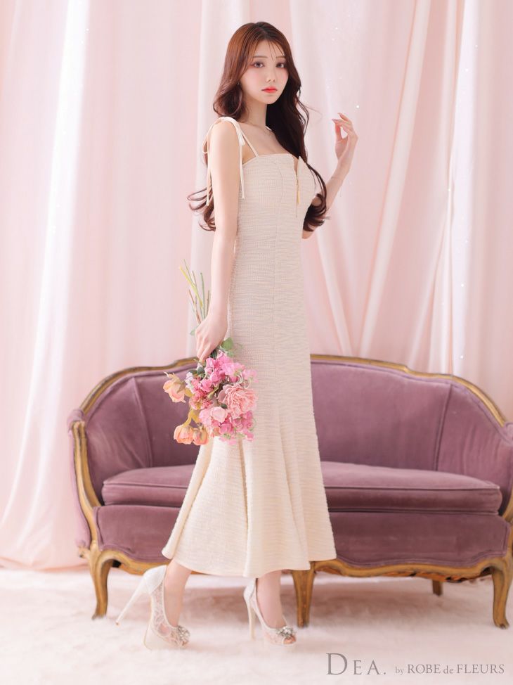 ふわふわニットが大人ガーリー☆ [DEA.byROBEdeFLEURS/ディアバイローブドフルール] 高級 リボン キャミソール フロントジップ ニットツイード マーメイド 膝丈ドレス