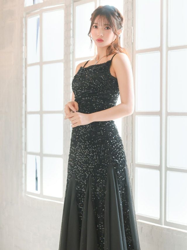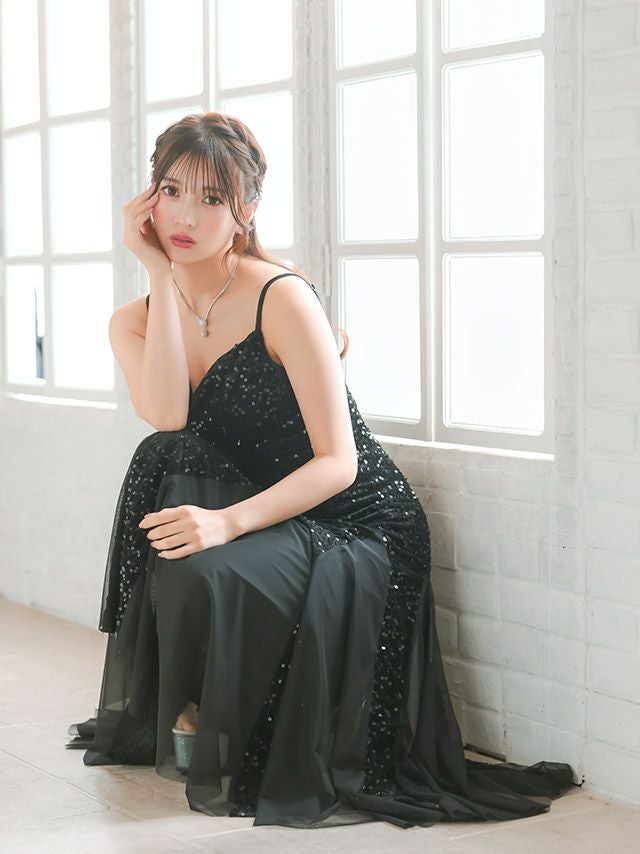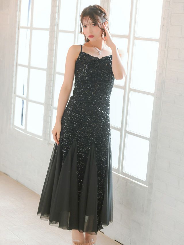 3. ロングドレス バースデー タイト 大人 マーメイド シフォン キャミソール キラキラ スパンコール 黒 キャバドレス (黒嵜菜々子着用) [tk-ld892617]