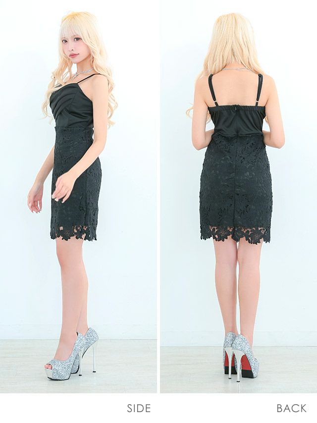 華やぎをプラス♪ 背中魅せ ギャザー切り替えケミカルフラワーレースキャミソールタイトミニドレス (向葵まる着用)
