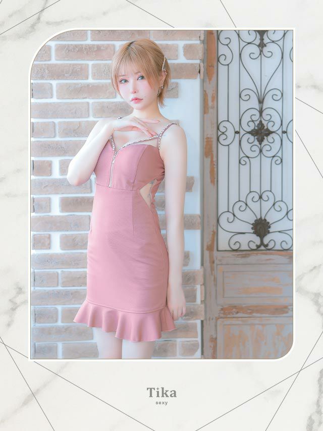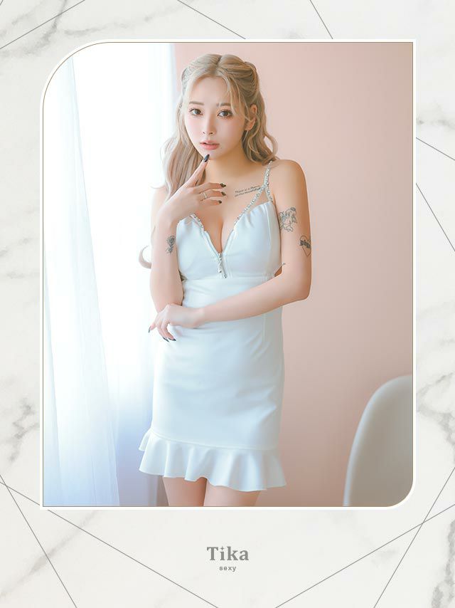 3. ストーン付き キャミソール バストコード ジップ セクシー シアーくびれ 裾フリル 谷間魅せ タイトミニドレス (Sサイズ~Lサイズ) (戦慄かなの/キャバドレス着用)