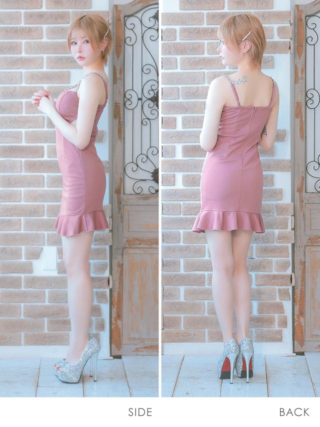 5. ストーン付き キャミソール バストコード ジップ セクシー シアーくびれ 裾フリル 谷間魅せ タイトミニドレス (Sサイズ~Lサイズ) (戦慄かなの/キャバドレス着用)