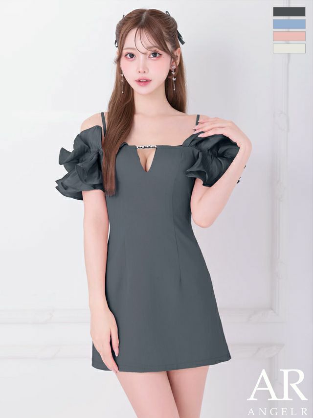他の画像を見る お顔周りをスッキリ魅せるデザイン☆ 予約商品【2月下旬入荷予定】[Angel-R/エンジェルアール] 高級 ブランド Aラインミニドレス キャミソール フリルリボン パールショルダー ワンカラー ¥ 28,380 税込 お気に入りに追加