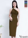 着るだけで女性らしさを格上げ☆ [Veautt/ヴュート] 高級 ブランド タイト膝丈ドレス ワンショルダー ネックビジュー ドレープ ファスナースリット (伊藤舞雪着用)