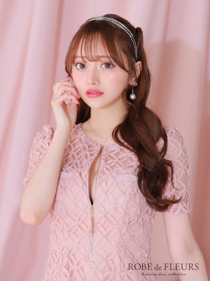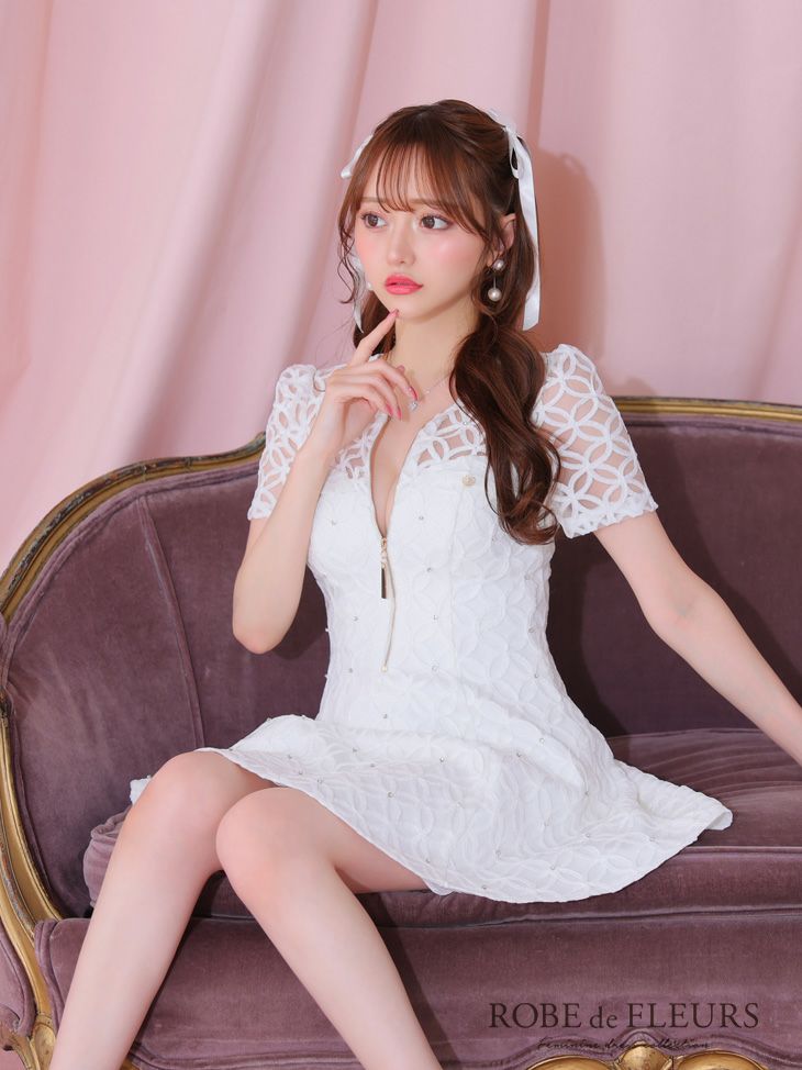 キャバドレス ミニドレス ROBEdeFLEURS ローブドフルール 高級ビジューバストジップシースルーレース半袖フレアミニドレス