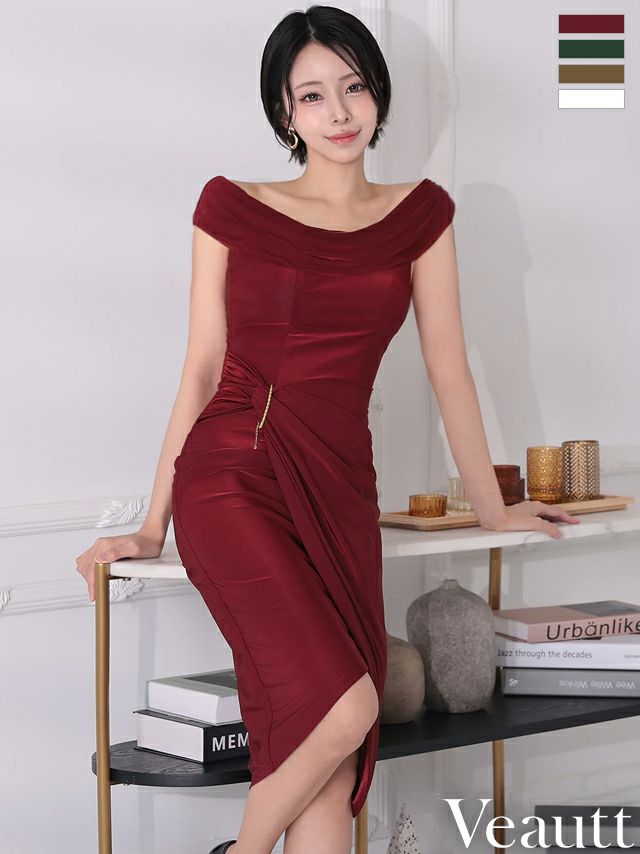 他の画像を見る 美しいデコルテラインを演出♡ [Veautt/ヴュート] 高級 ブランド タイト膝丈ドレス オフショルダー ラップ風 タックデザイン (ゆんころ着用) ¥ 31,680 税込 お気に入りに追加
