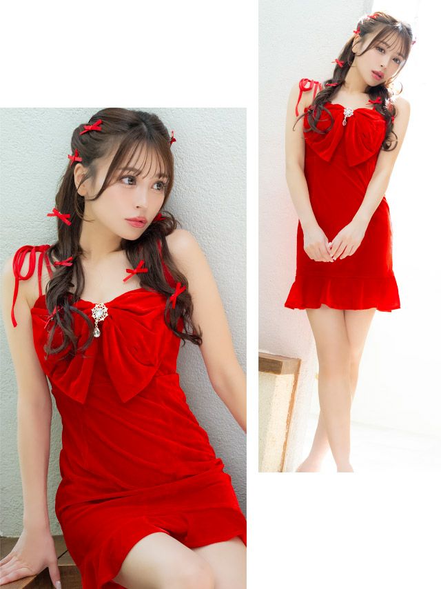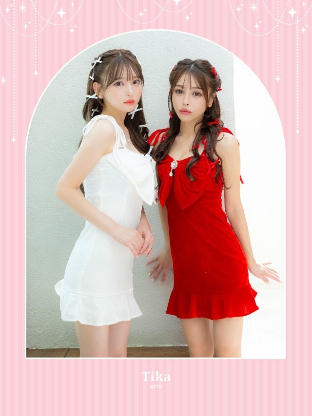 5. ビジュー付き リボン ガーリー キャミソール ベロア 裾フリル ストレッチ タイトミニドレス (Sサイズ~Lサイズ) (れいぽよ/キャバドレス着用)