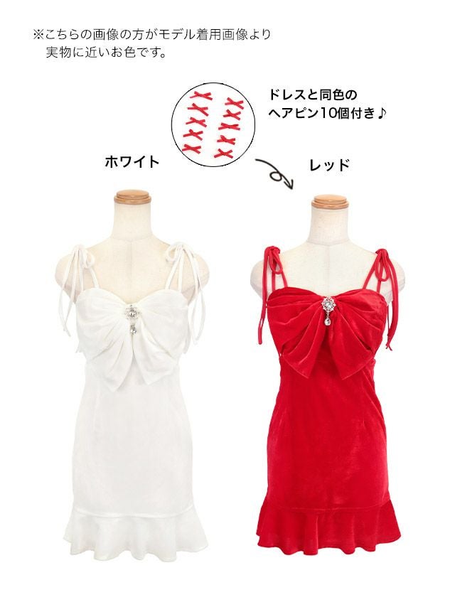 ビジュー付きリボンデザインキャミソールベロア裾フリルストレッチタイトミニドレスのカラーバリエーション
