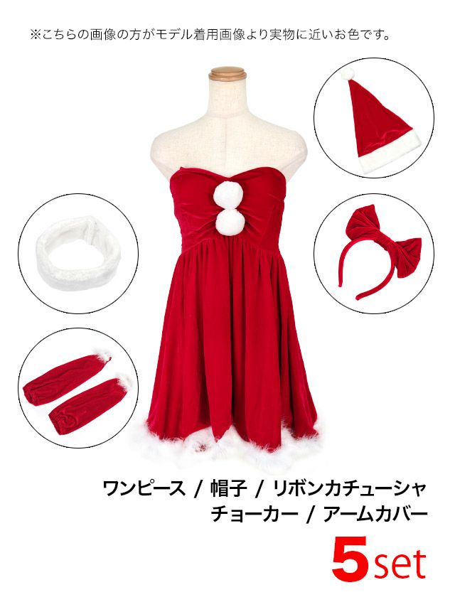 5. サンタコスプレ 5点set ハートカットベア谷間セクシー フレアスカート ガーリー ポンポン 王道 [ワンピース+帽子+リボンカチューシャ+チョーカー+アームカバー]
