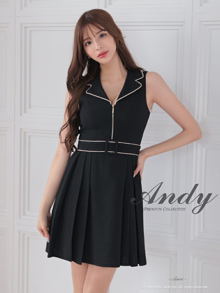 キャバドレス Andy アンディ 高級襟デザインノースリーブウエストベルトフロントジップバイカラーフレアミニドレス