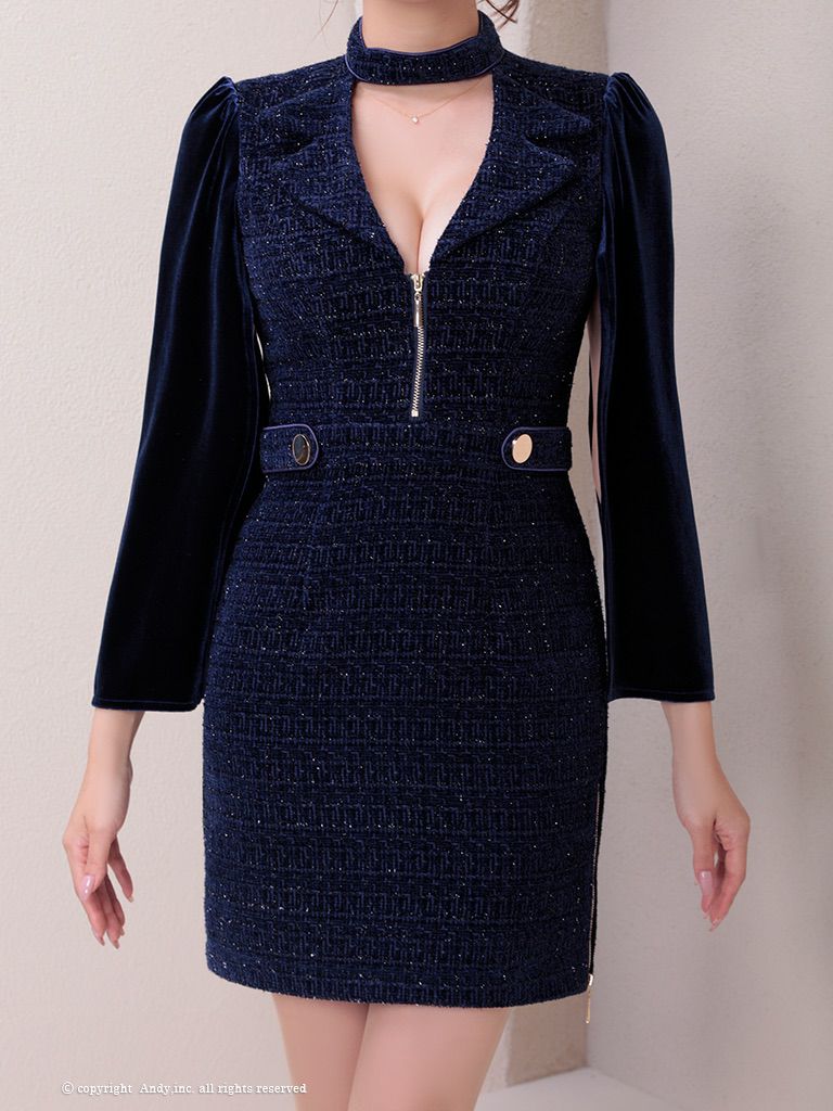 キャバドレス Andy アンディ 高級2way長袖襟デザインジップラメツイードウエストベルトタイトミニドレス