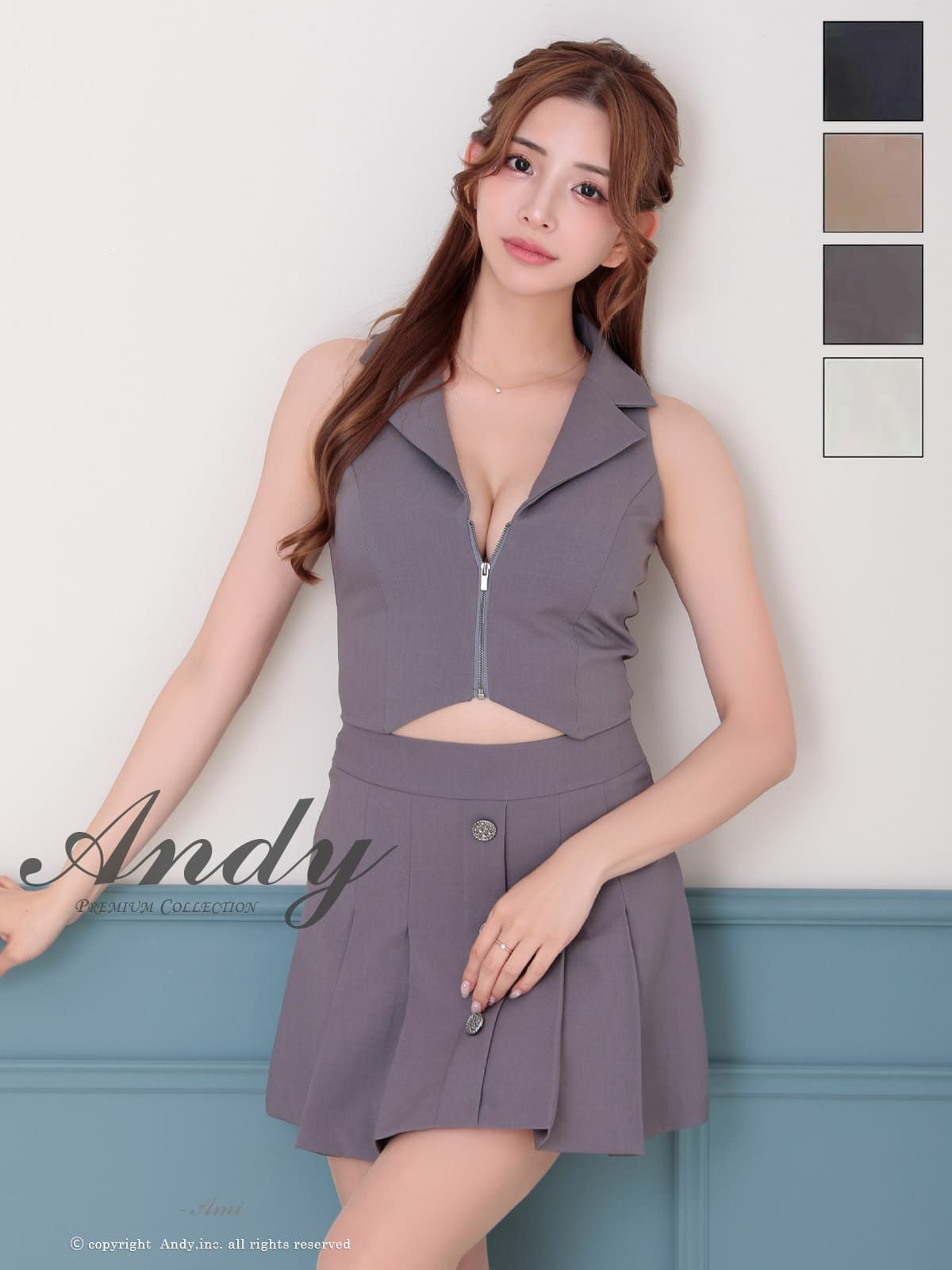 キャバドレス Andy アンディ  高級 ノースリーブ 襟付き プリーツ ジップ ワンカラー セットアップ フレアミニドレス