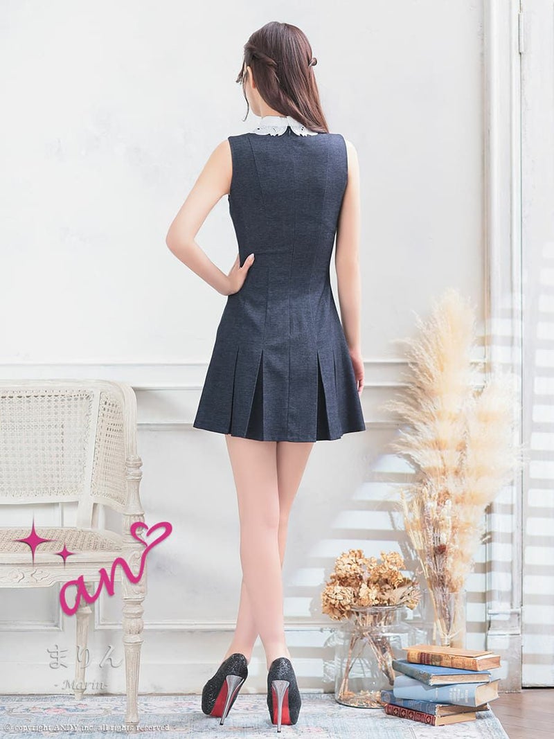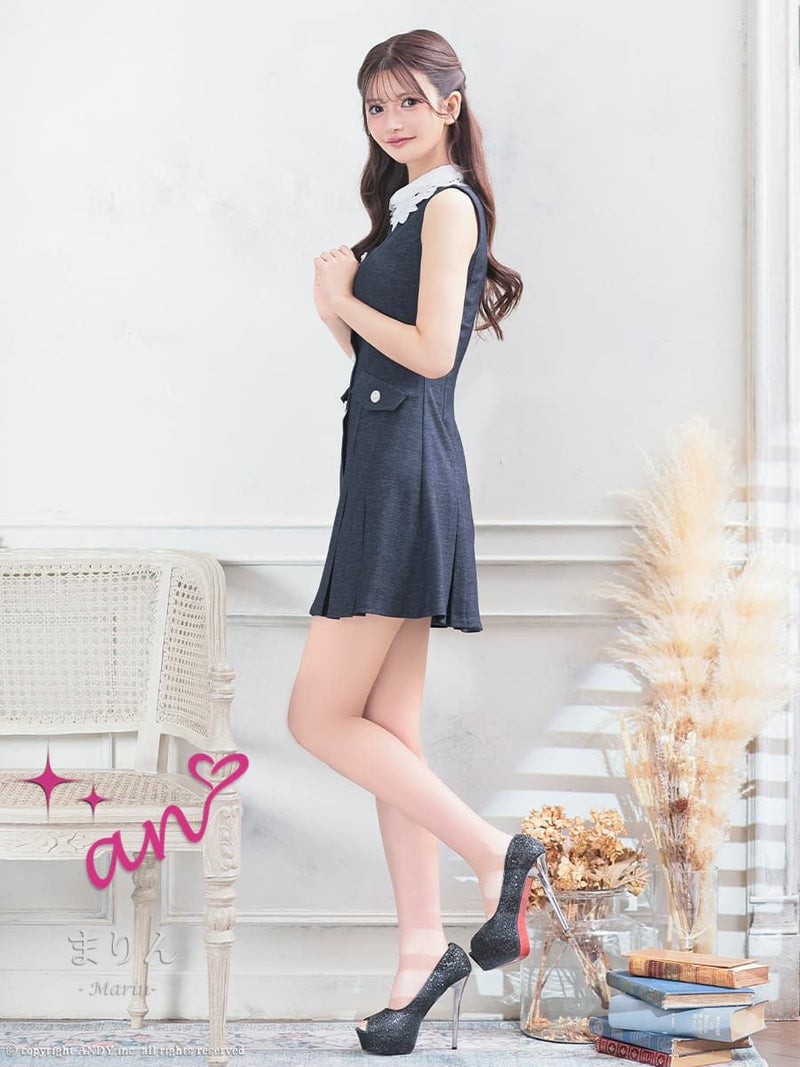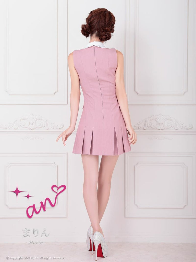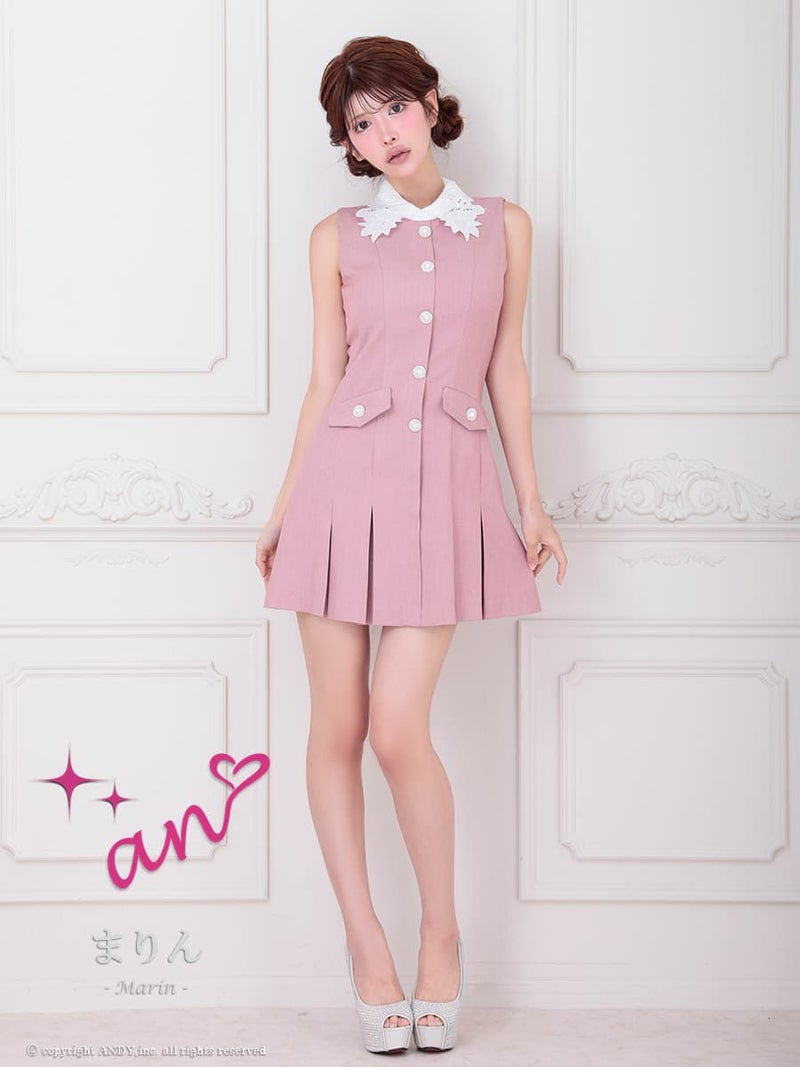 キャバドレス an アン 高級 ノースリーブ 襟付き パールボタン ワンカラー プリーツ ポケット フレアミニドレス