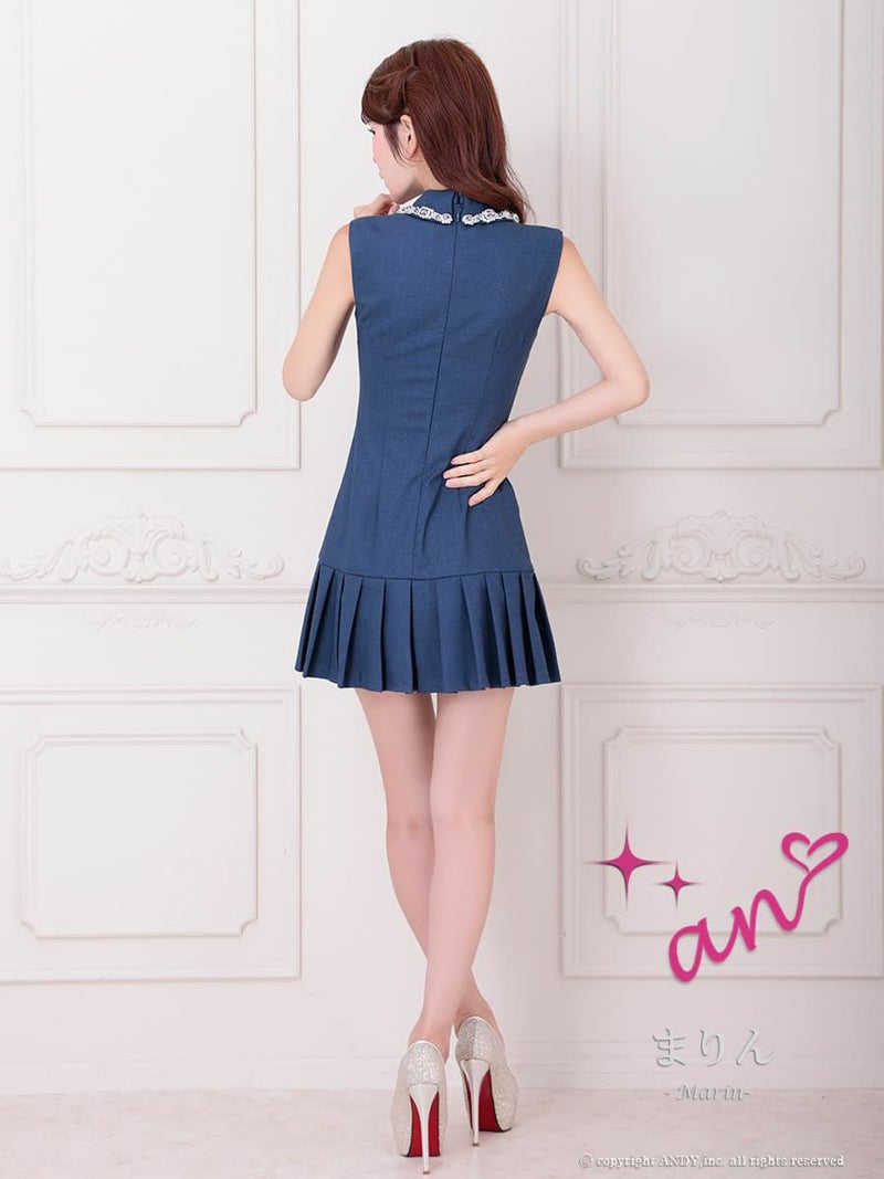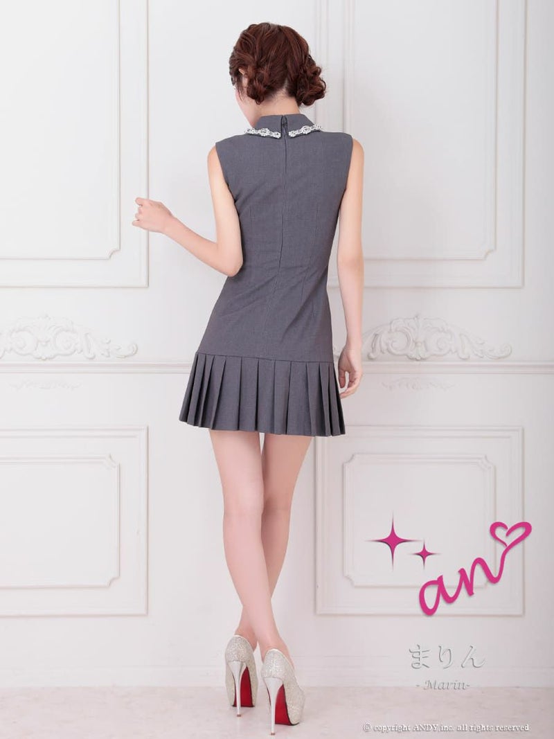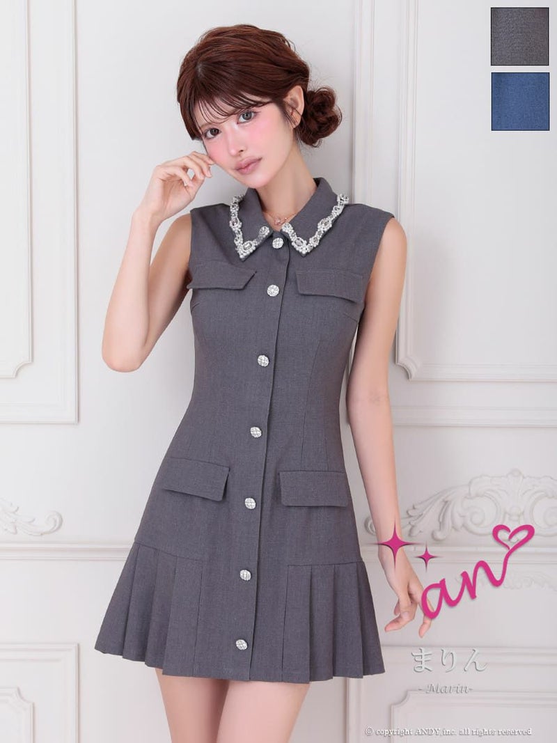 キャバドレス an アン 高級 ノースリーブ 襟付き ワンカラー ビジュー ボタン プリーツ フレア ミニドレス