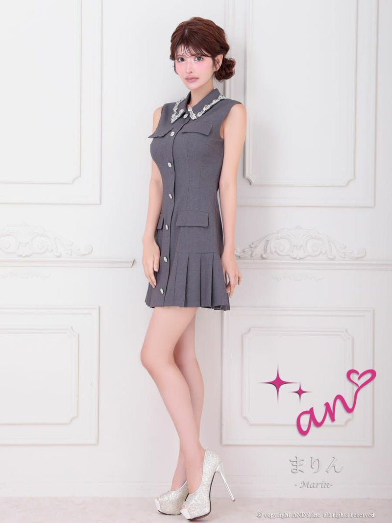 襟元のビジューがさりげなく彩る♡ [an/アン] 高級 ノースリーブ 襟付き ワンカラー ビジュー ボタン プリーツ フレア ミニドレス