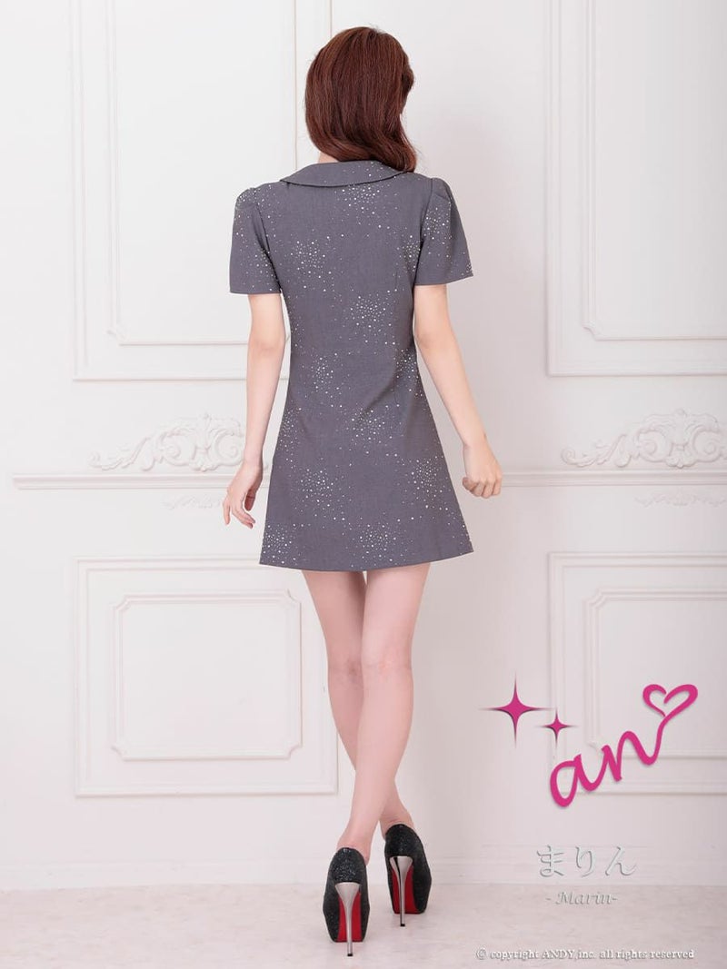 キャバドレス an アン 高級 半袖 ワンカラー ビジュー 襟付き パールボタン フレア ミニドレス