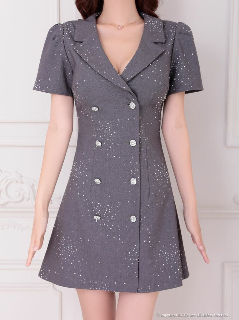 5. [an/アン] 高級 半袖 ワンカラー ビジュー 襟付き パールボタン フレア ミニドレス