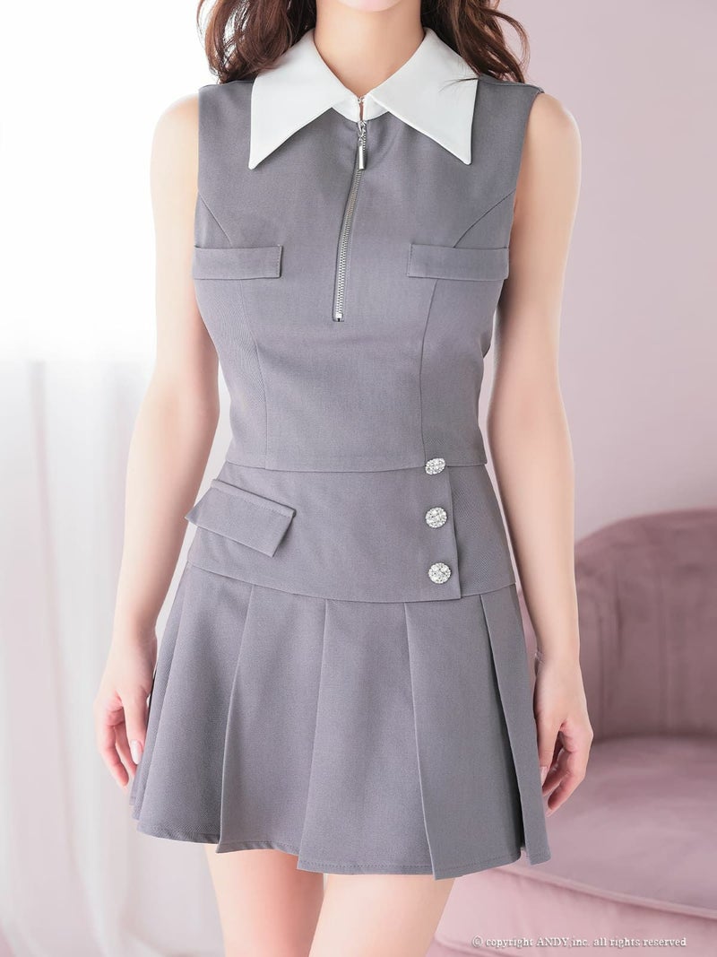 今っぽさ溢れるセットアップ♡ [an/アン] 高級 ブランド フレアミニドレス セットアップ ノースリーブ ジップ 襟付き プリーツ ビジューボタン