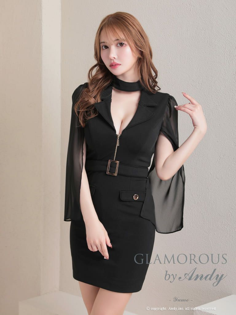 チョーカー風の襟がクールな印象に! [AndyGLAMOROUS/アンディグラマラス] 高級 フロントジップ ウエストベルト 取り外し シフォン 袖あり ノースリーブ バストカット 谷間魅せ タイトミニドレス