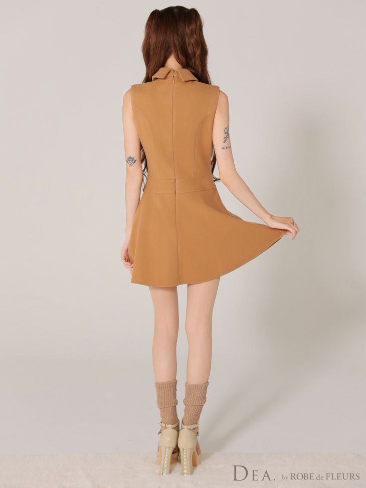 ダブルボタンがお洒落にアクセント♡ [DEA.byROBEdeFLEURS/ディアバイローブドフルール] 高級 ワンカラー ダブルボタン 襟付き ノースリーブ 胸元カバー フレアミニドレス (れむ着用)