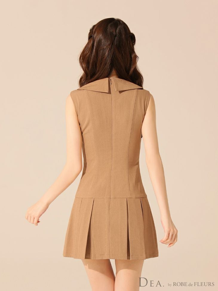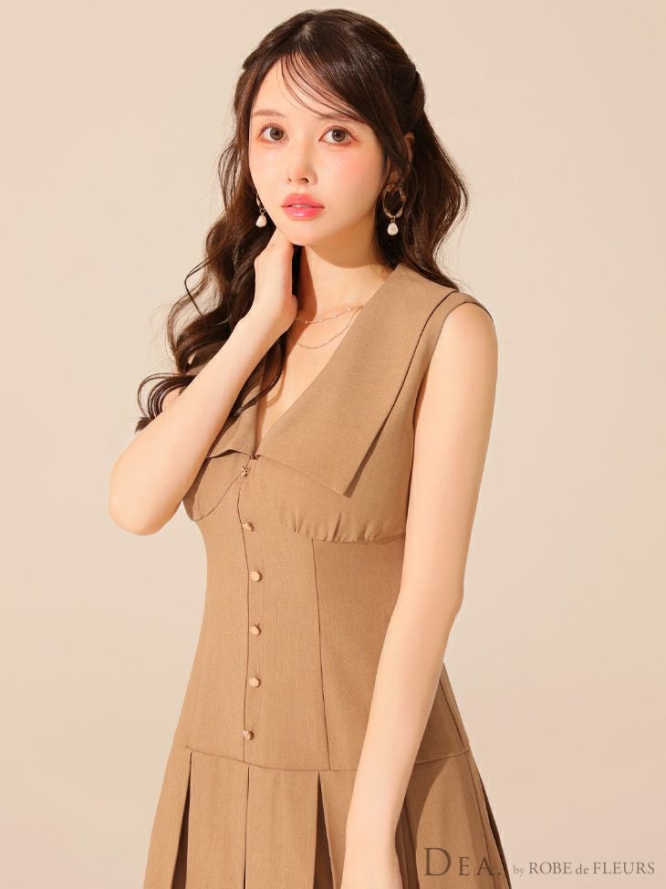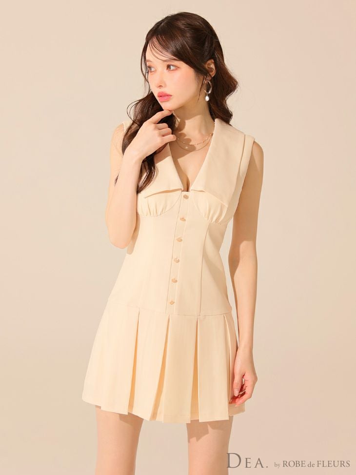 スッキリとしたお顔周りに♡ [DEA.byROBEdeFLEURS/ディアバイローブドフルール] 高級 襟付き ノースリーブ シンプル ワンカラー 谷間魅せ プリーツ フレアミニドレス