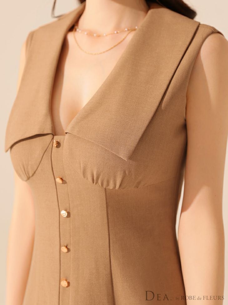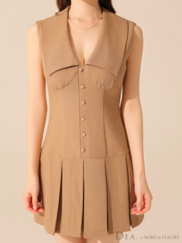 5. [DEA.byROBEdeFLEURS/ディアバイローブドフルール] 高級 襟付き ノースリーブ シンプル ワンカラー 谷間魅せ プリーツ フレアミニドレス