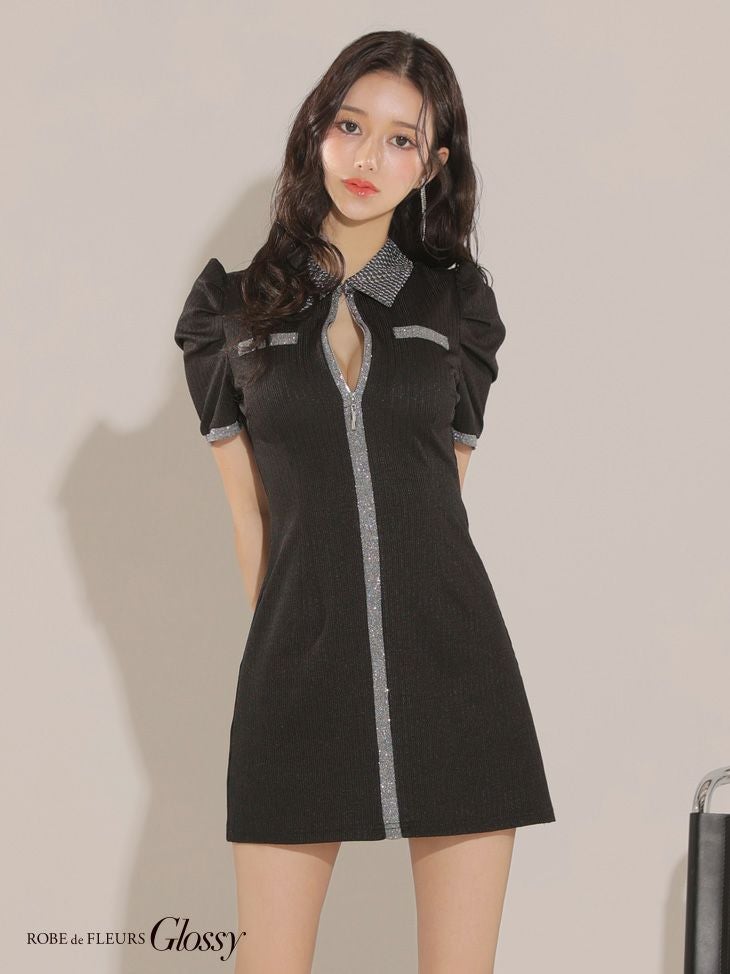 5. [ROBEdeFLEURSGlossy/ローブドフルールグロッシー] 高級 襟付きフロントジップ ラメパイピング 半袖 フレアミニドレス