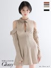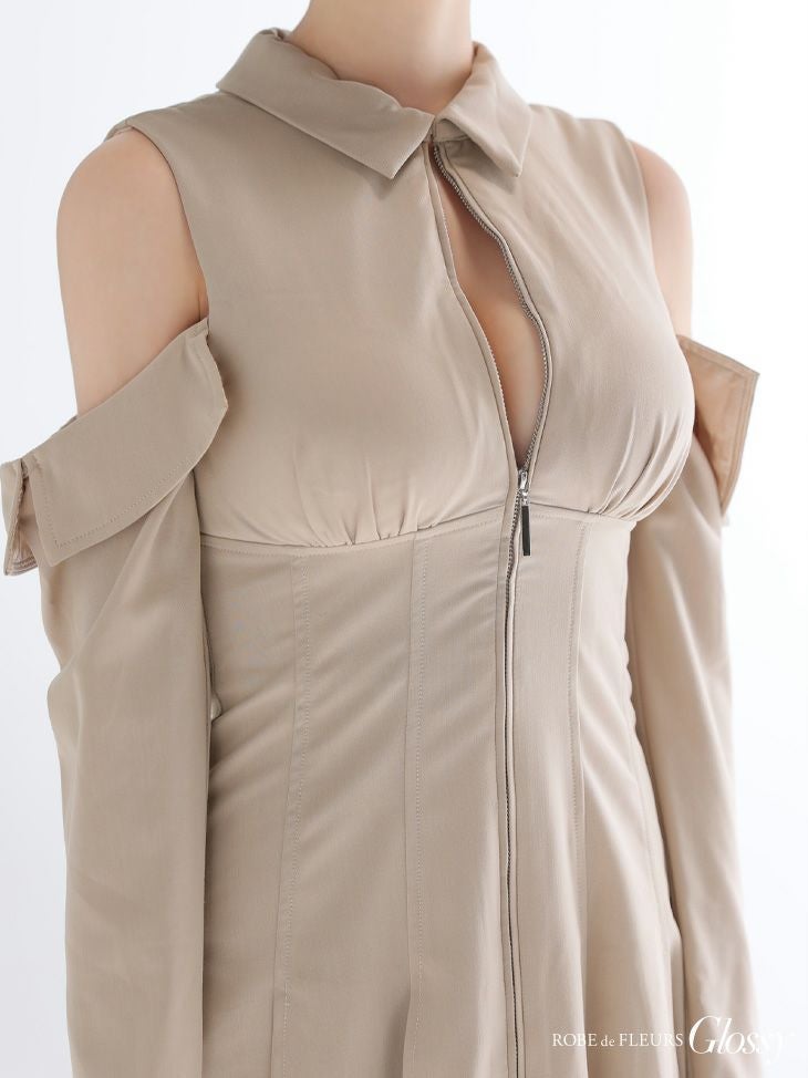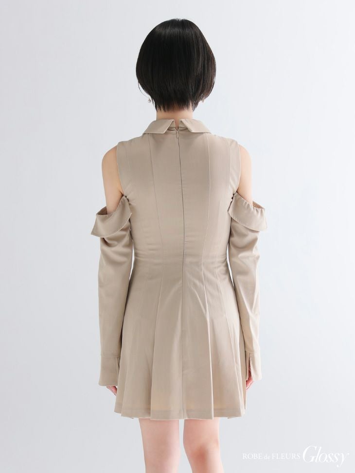 ヘルシーな肌見せで魅了する♡ [ROBEdeFLEURSGlossy/ローブドフルールグロッシー] 高級 ブランド Aラインミニドレス 長袖 袖あり 肩出し 襟付き ジップ プリーツ