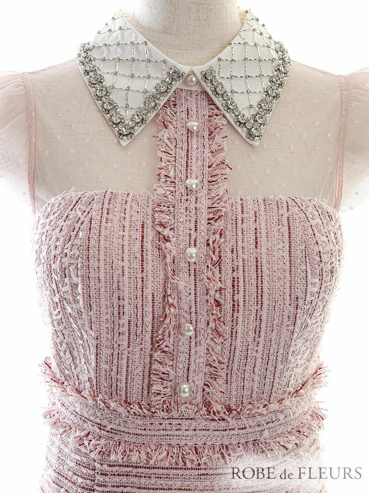 ツイードとビジュー襟がガーリーな一枚♡ [ROBEdeFLEURS/ローブドフルール] 高級 ラメツイード ビジュー 襟付き フリル袖 ノースリーブ 台形 ワンピース フレアミニドレス