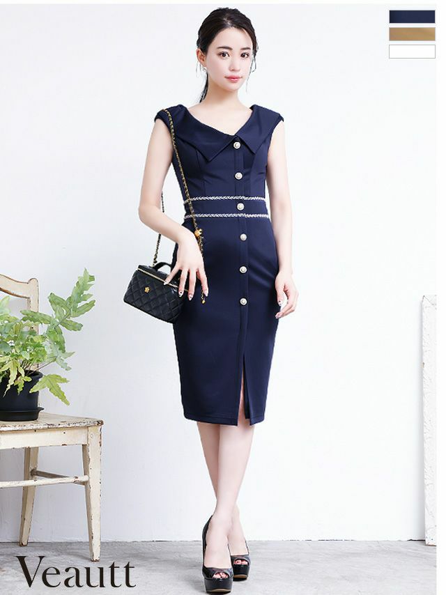 キャバドレス ミニドレス [Veautt/ヴュート] 高級ノースリーブ襟デザインワンカラースリット膝丈タイトドレス