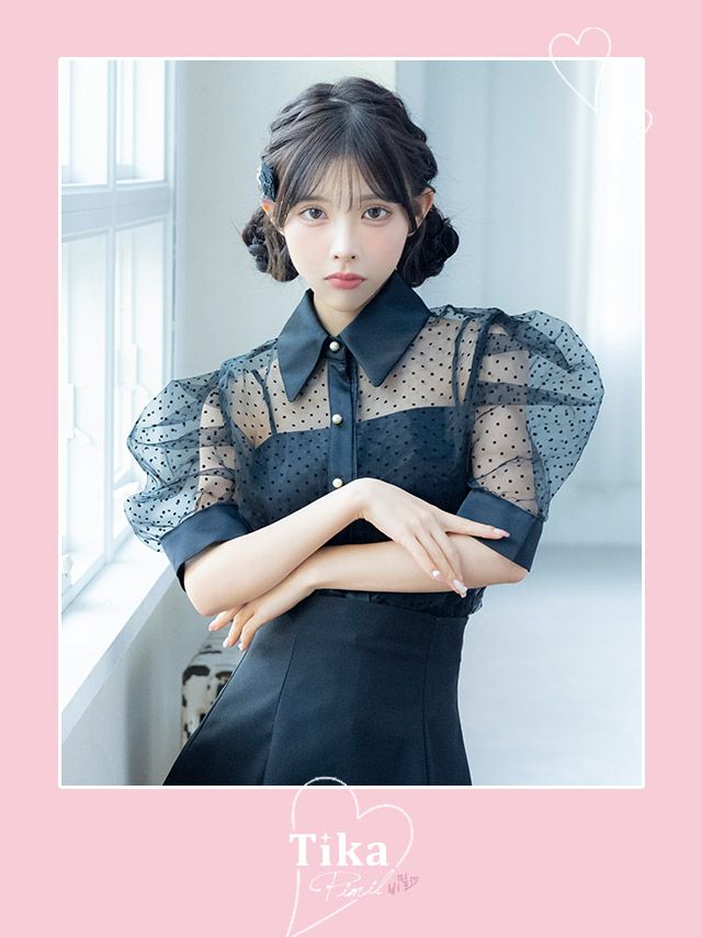 3. [韓国ドレス] 襟付き 半袖 ドット柄 シアーシャツセットアップ フレアミニドレス (Sサイズ/Mサイズ) (緩苺/キャバドレス着用) [TikaPimil]