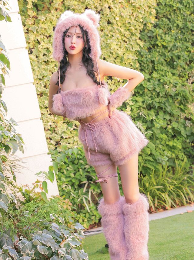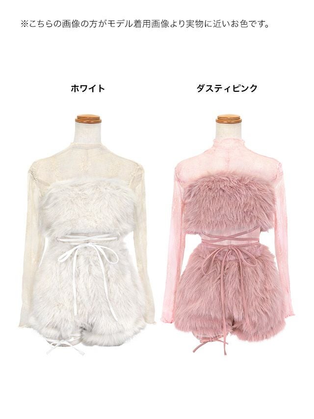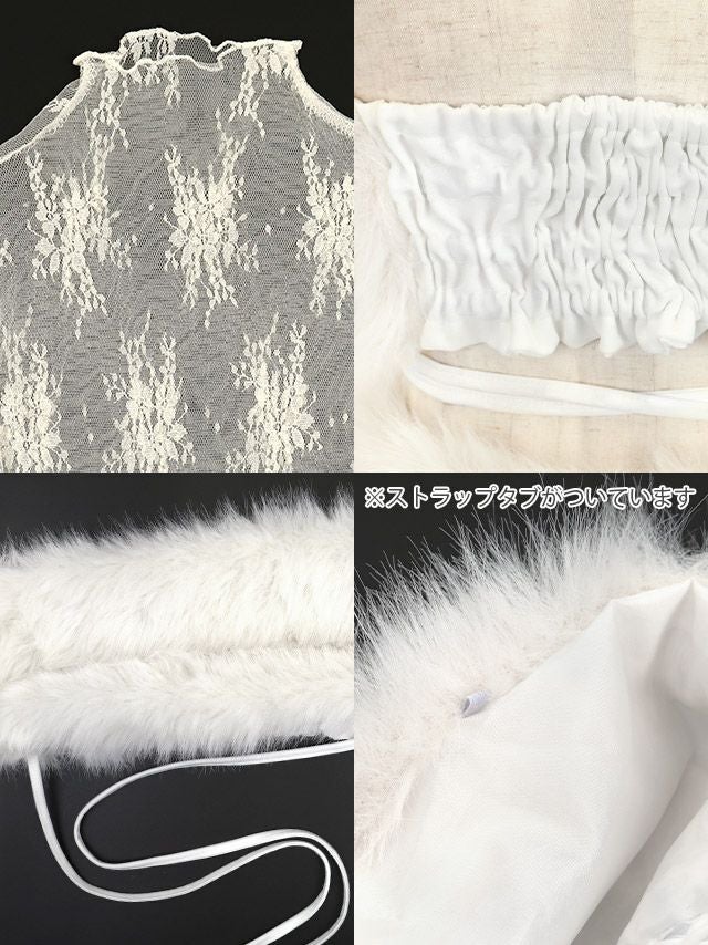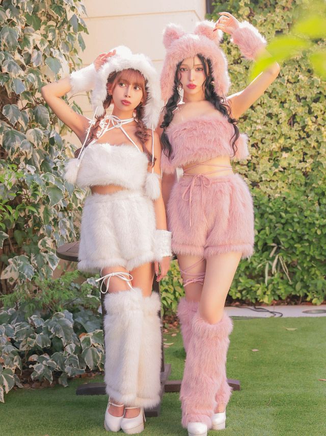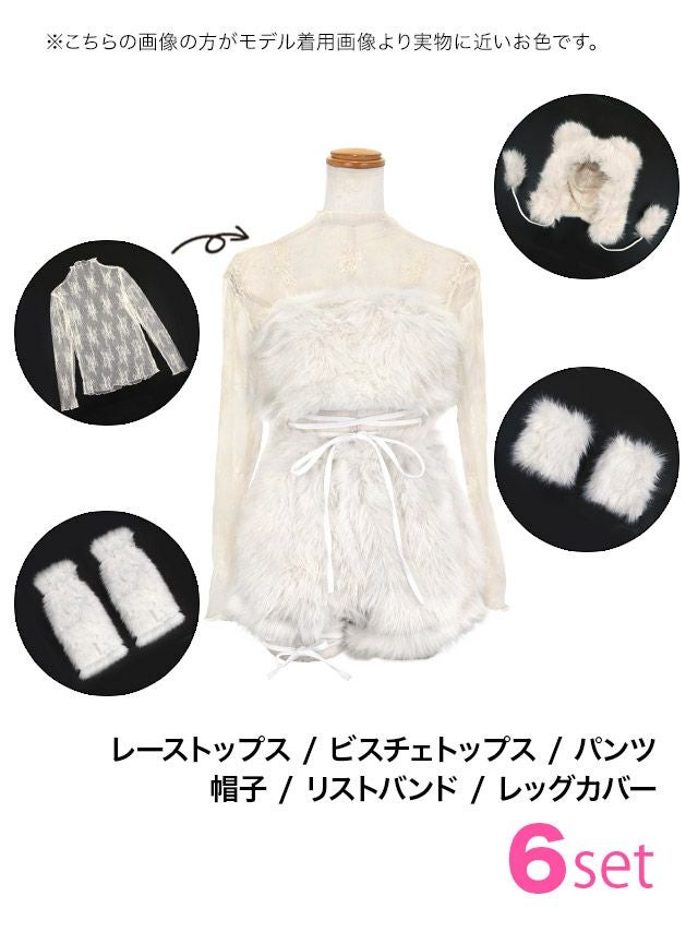 4. [SUPER SALE] コスプレ コスプレ テディベア へそ出し セクシー ふわもこ ガーリー ツイン アニマル 2Way 袖あり 6点セット (レーストップス/ビスチェトップス/パンツ/帽子/リストバンド/レッグカバー)
