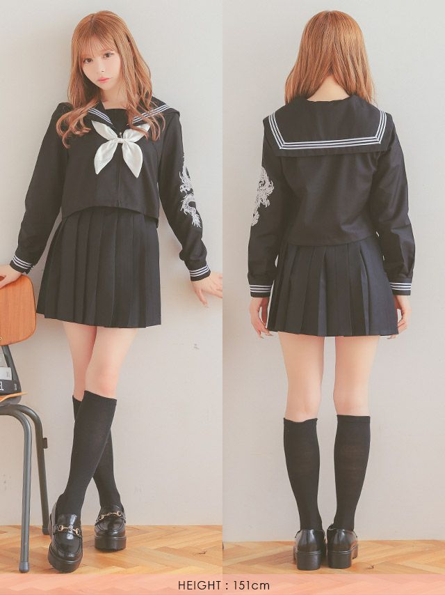 3. [SALE] コスプレ 制服 ドラゴン刺繍 ライン入り ミニ丈 体型カバー 袖あり フレアスカート セーラー服 4点セット (セーラー服上下/スカーフ/ソックス)