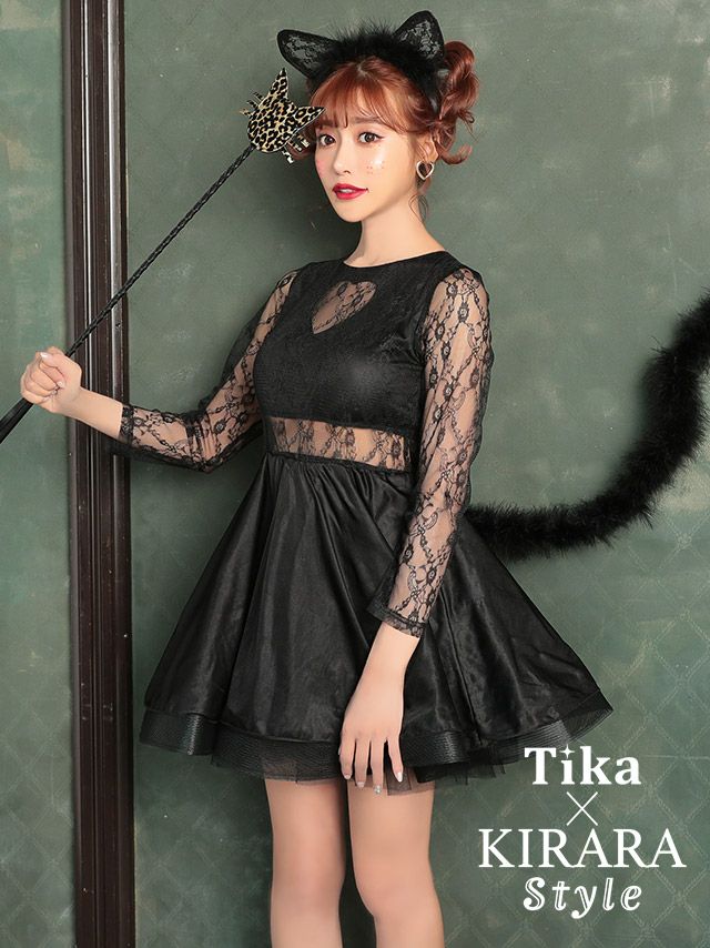 胸元に視線を集中コスプレ♪ [コスプレ] 黒猫袖あり体型カバーフレアスカートガーリーアニマル [2点セット] (ワンピース/カチューシャ)