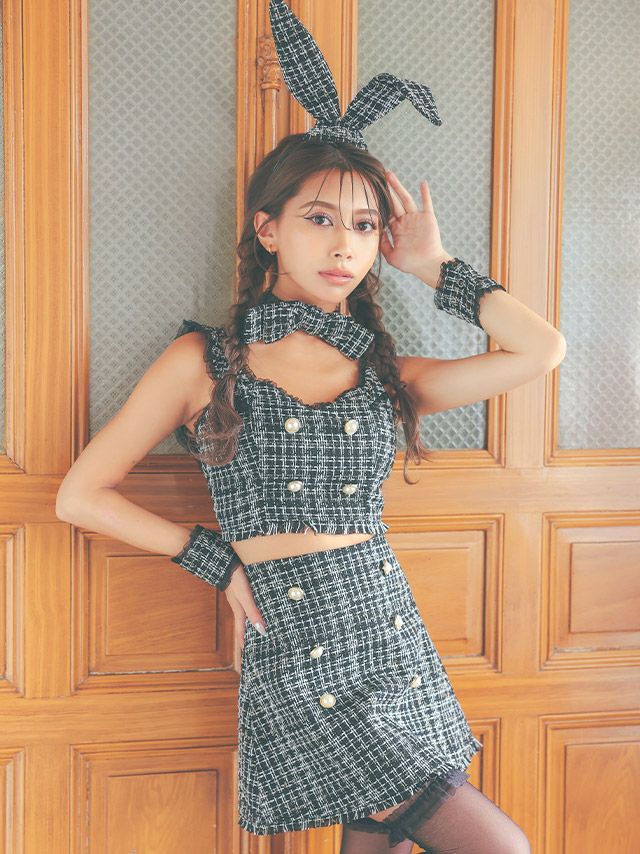 5. [SALE] コスプレ イースター へそ出しツイードチュールパールボタン台形スカートガーリーツインバニー [6点セット] (首元リボン/トップス/スカート/カチューシャ/カフス/尻尾)