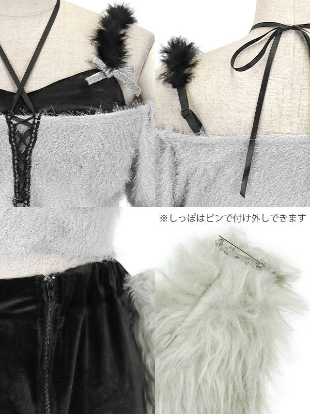愛らしいふわもこウルフ♡ [コスプレ] コスプレ ウルフ ふわもこ へそ出し ベロア ガーリー ツイン アニマル 6点セット (トップス/スカート/カチューシャ/アームカバー/レッグウォーマー/しっぽ)