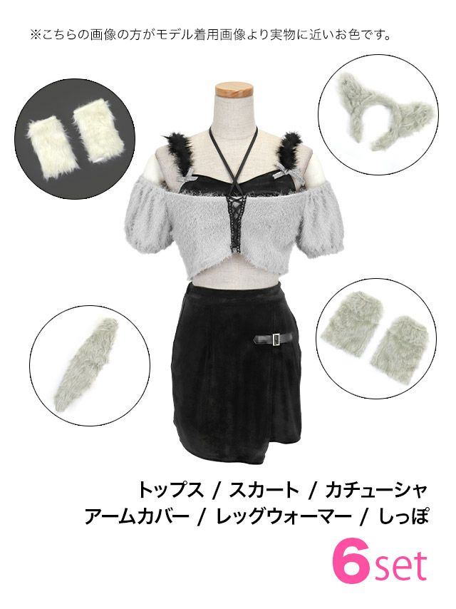 5. [コスプレ] コスプレ ウルフ ふわもこ へそ出し ベロア ガーリー ツイン アニマル 6点セット (トップス/スカート/カチューシャ/アームカバー/レッグウォーマー/しっぽ)