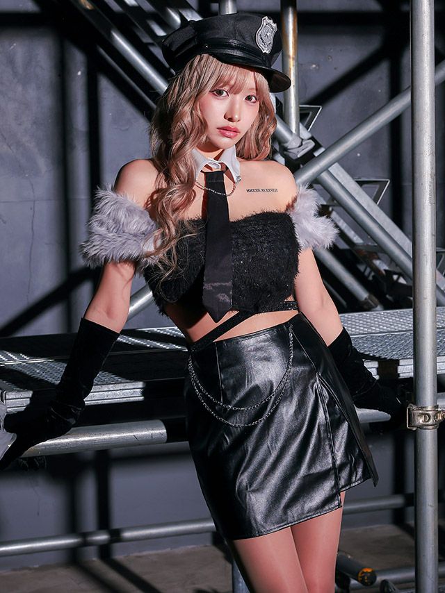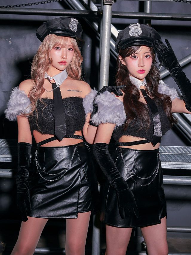 あざとさ全開なsexyポリス♡ [コスプレ] ポリス コスプレ 制服 ふわふわトップス へそ出し レザー タイト ミニスカ セクシー ツイン 8点セット (付け襟/ネクタイ/トップス/スカート/チェーン/帽子/透明ストラップ/グローブ)