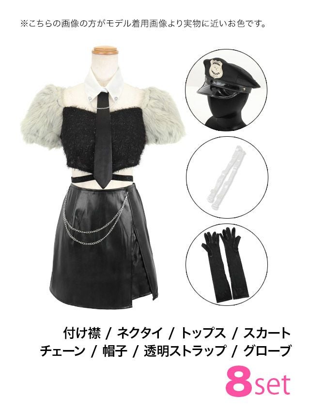 5. [コスプレ] ポリス コスプレ 制服 ふわふわトップス へそ出し レザー タイト ミニスカ セクシー ツイン 8点セット (付け襟/ネクタイ/トップス/スカート/チェーン/帽子/透明ストラップ/グローブ)