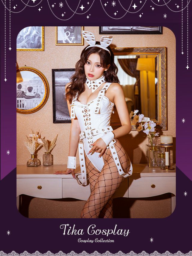 4. [SALE] コスプレ イースター レースアップレザーアイレットハイレグ谷間ボディコンセクシーインポートバニー [5点セット] (ワンピース/カチューシャ/付け襟/カフス/ベルト)