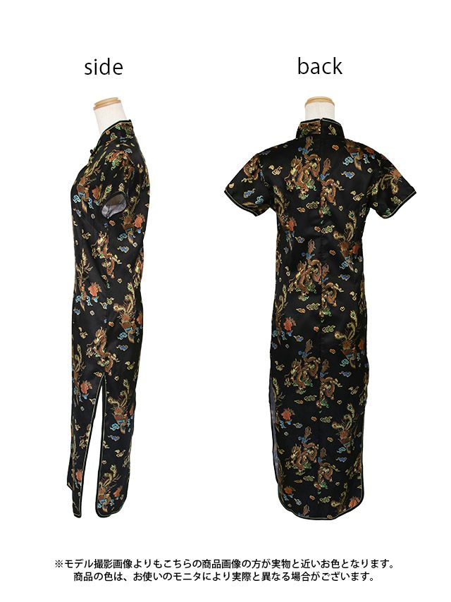 ハロウィンコスプレ 1点set 龍柄デザイン刺繍サイドスリットタイトロング丈プチプラチャイナドレスのフロントバック全身
