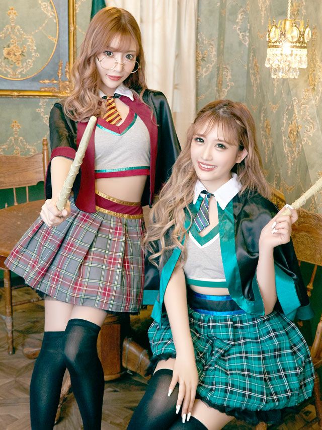 3. [コスプレ] 魔法学校 制服 へそ出し 体型カバー フレアスカート キャラクター [3点セット] (トップス/スカート/ケープ)
