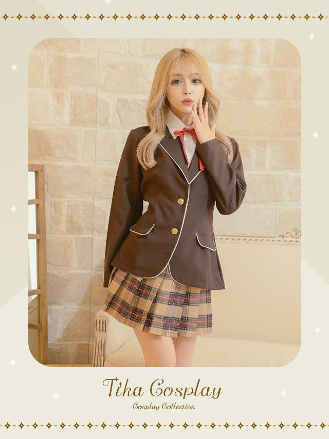 周囲と差をつける韓国風デザイン♪ [コスプレ] 袖ありパイピングブレザー×プリーツチェックフレアスカートスクールユニフォーム [3点セット] (シャツ付きジャケット/スカート/リボン)