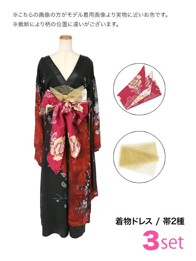 3. [コスプレ] コスプレ 花魁 節分 お化けの日 アートフラワー セクシー 谷間 ロング丈 和装ドレス 3点セット (着物ドレス/帯2種)