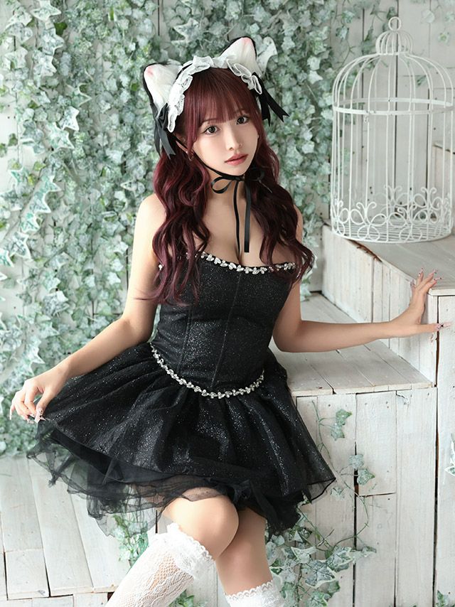 6. [コスプレ] 猫 コスプレ ビジュー ラメ ガーリー ボリュームフレアスカート ロリーター ペア アニマル 3点セット (ワンピース/猫耳/ヘッドドレス)