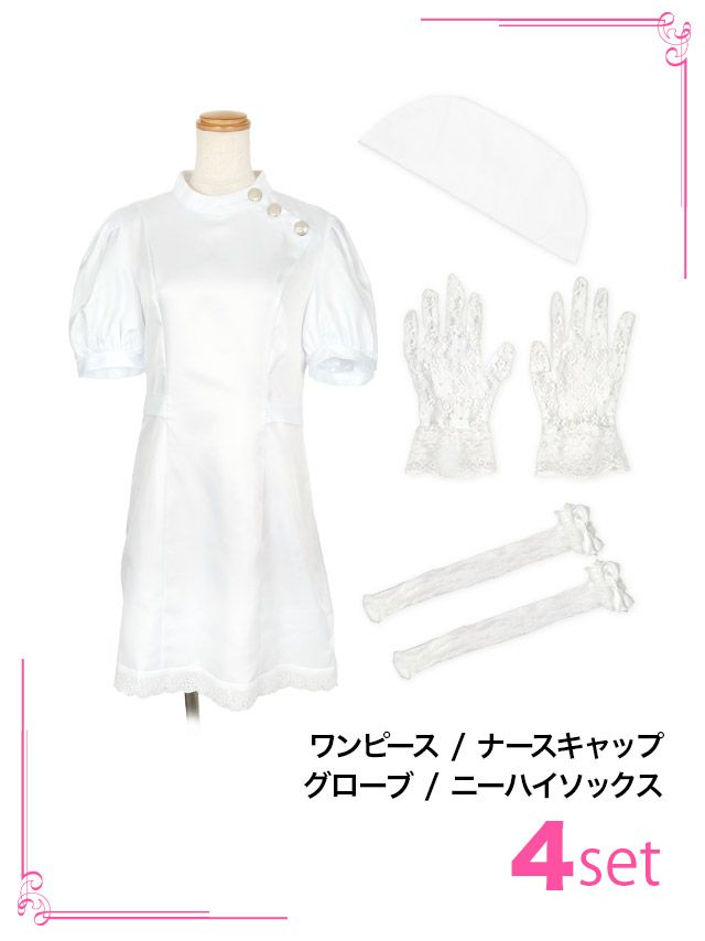 4. [コスプレ] レースデザイン体型カバーセクシーナース [4点セット] (ワンピース/ナースキャップ/グローブ/ニーハイソックス)