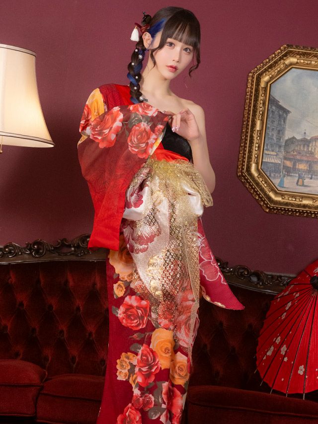 個性的なデザインで周囲と差を付けれる♪ [コスプレ] コスプレ 花魁 桜まつり セクシー ワンショル スリット ローズ 和装ドレス 3点セット (着物ドレス/帯2種) ゆりにゃ×戦慄かなのTikaコラボ