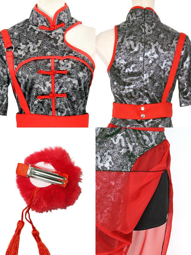 被らないクールな1着♪ [コスプレ] チャイナ コスプレ スリット ロング丈 体型カバー アシンメトリー カンフー チャイナ服 5点セット (トップス/ボトムス/ベルト/髪飾り/グローブ)