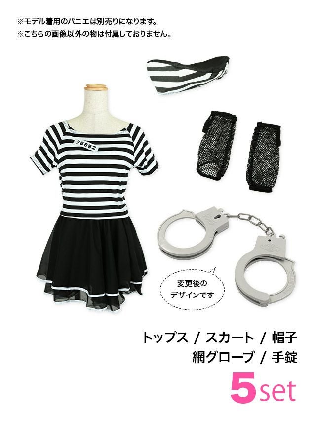 5. [SALE] コスプレ 囚人へそ出しセクシー体型カバーフレアスカート付き [5点セット] (トップス/スカート/帽子/網グローブ/手錠)