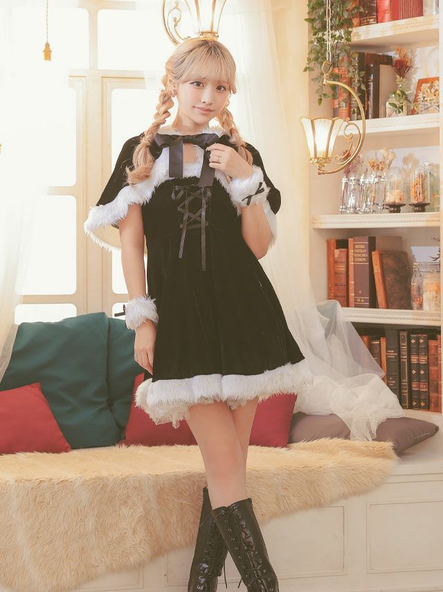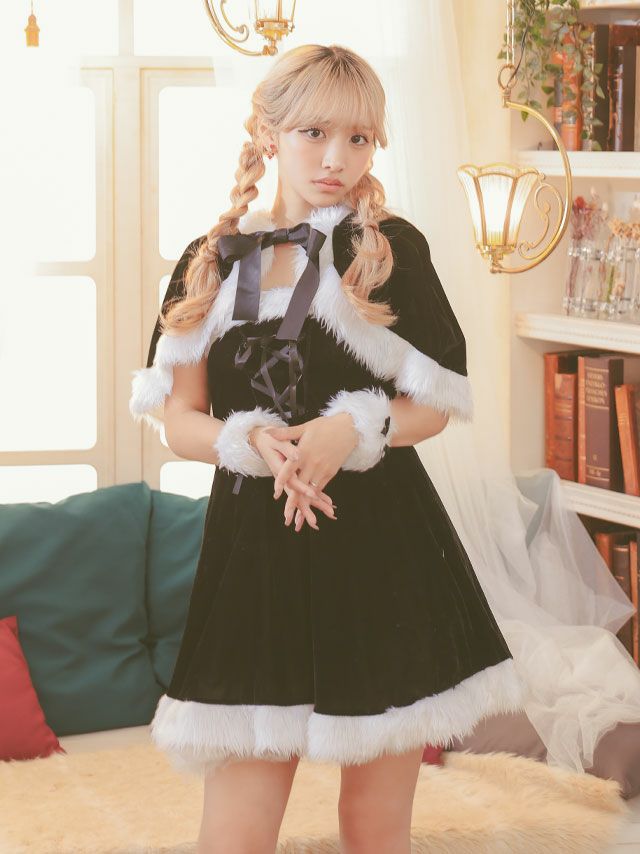 6. サンタコスプレ 4点set まやりん着用 猫耳ケープ付き編み上げデザインフレアスカートガーリーふわふわファーアニマル [フード付きケープ+ワンピース+カフス+透明ストラップ]